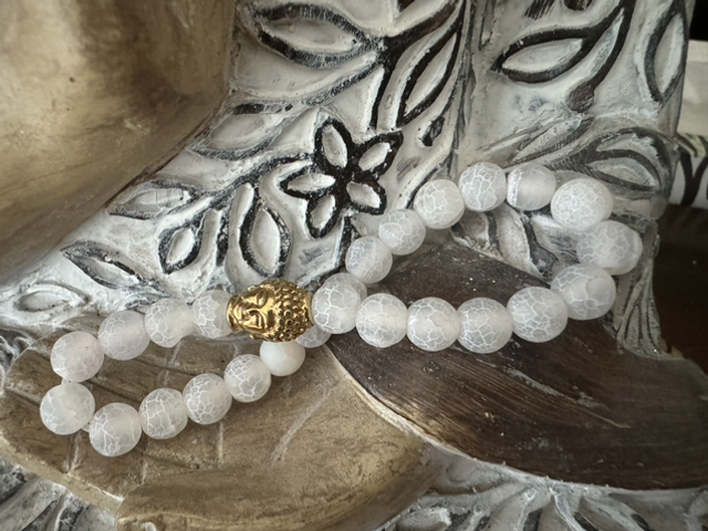 Armband weißer Achat geeist mit Edelstahl Buddha Kopf goldfarbend